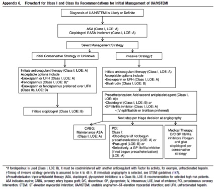 Below is a flow chart summarizing the 2011 ACC/AHA guidelines for management of UA/NSTEMI: